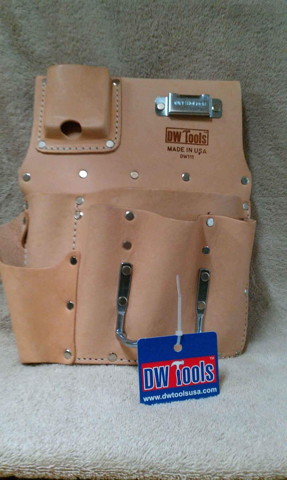 Top grain leather with multiple tool pockets; metal tape clip; knife slot and hammer holder; left or right.